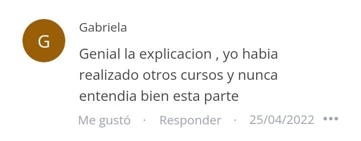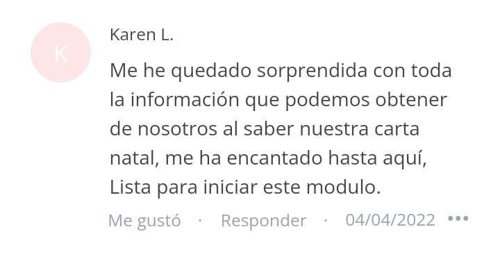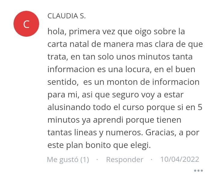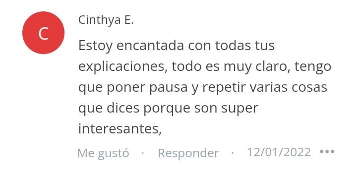 “…Es un curso con mucho más contenido que otros que tienen un valor 10 veces mayor. Realmente estoy sorprendida de cómo, al relacionar todo, pude librarme de muchos de mis problemas. Gracias…”